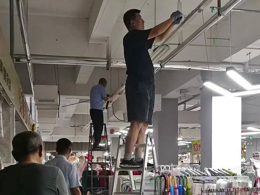 高新店街市改造,王金文和劉軍偉自己動手為燈光較暗的區(qū)域安裝燈管。
