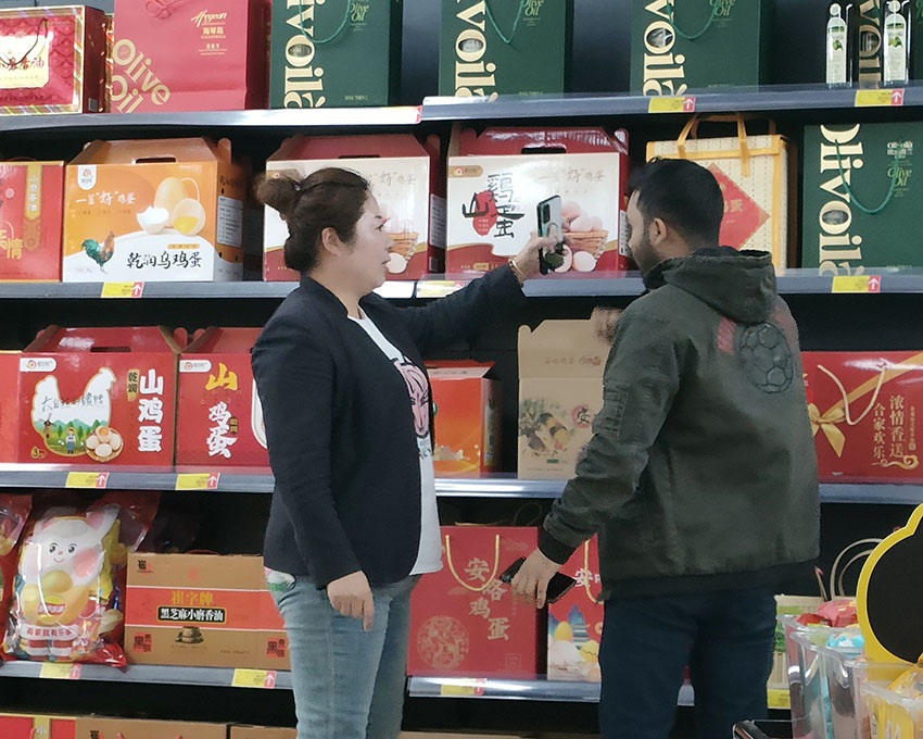 事情是這樣的,有一次,有一個外國男生站在雞蛋區那里比劃了半天,張慕華以為是問雞蛋價格,于是就拿著雞蛋用英語說了價格。結果,小男孩著急地捂著肚子,還是不停地在比劃。由于語言不通,比劃了大半天,倆人也沒溝通明白。情急之中,他拿出手機打下英語,翻譯完后,竟然是問“廁所在哪里?”。看到這句翻譯過來的話,我們都不好意思地笑了。以前,他們雖然也是超市的常客,但基本上不太和我們交流。經過這次以后,我們雙方也算是“接上頭”了。我們也學他通過手機下載翻譯軟件,把漢語轉換成英語,便于溝通,讓他們能有更好的購物體驗。后來,經過一來二去的溝通交流,我們了解到他們四個人來自孟加拉國,是來求學的,住在我們民生店附近,每周三會定期來采購大米、蔬菜、雞蛋等生活用品。因為我還算是會幾句英語,所以只要他們一來,店員們就去叫我,生怕耽誤他們購物。記得還有一次,他們要買橄欖油,我們給他們介紹了好幾種食用的橄欖油都不行,我們也有點不知所措,那個男生就急得不停地抹臉,看到這個動作我們才恍然大悟,原來是擦臉用的橄欖油啊!